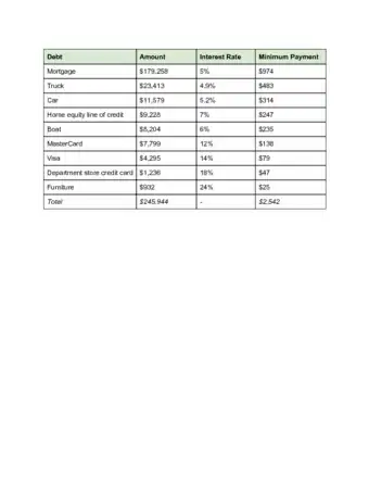 2Review your credit card statements. Make a list that identifies the details of your debt. For each account list: