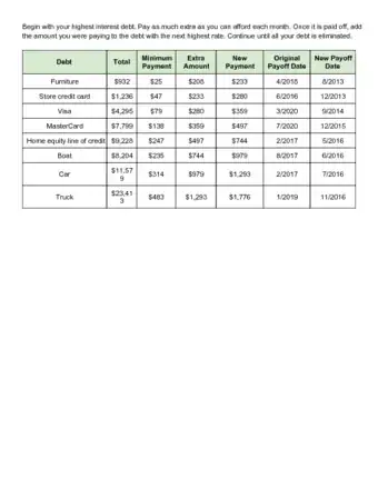 4Reassess your debt monthly. Make a list of your balances, interest, and fees every month. Check for unanticipated fees and to make sure your payments have been received and credited to your account.