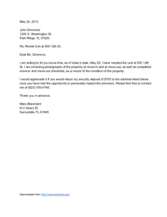 1Mail your landlord a letter requesting that she return your deposit. Be polite and simply inform the landlord that you have vacated the property and would appreciate the return of your deposit once she has had a chance to complete any checks and paperwork. When mailing the letter, include copies of the move-in and move-out photographs of the property as well as your completed move-in and move-out checklists.