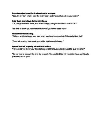 - If you have other children, encourage sharing between siblings. Ask your child to lend a toy or give part of a treat to a sibling, and offer praise for any attempts at sharing. Similarly, ask older children to share with your toddler and thank them for their efforts.