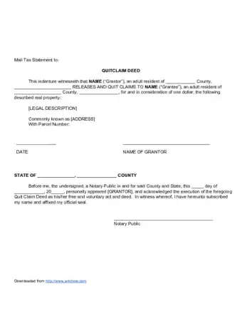 7Include the legal description of property. This will be on the current deed, which you can find at the county land records office. Some quitclaim deeds will require a parcel number or the metes and bounds description, or both.[7]