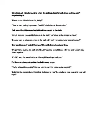 - For toddlers who are testing boundaries, you can emphasize that baths are non-negotiable. For example, say, "It’s okay that you don’t like bath time, but staying clean is important, so we don’t have a choice.”