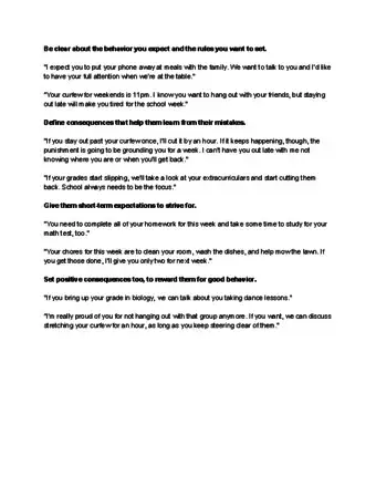 - For instance: “Since you broke curfew again, you are grounded for the next 2 weekends. However, if you do this list of extra chores, in addition to your normal chores and all your schoolwork, I’ll reduce it to 1 weekend.”