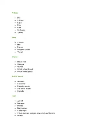 - Lean proteins include chicken, turkey, fish, beans, nuts, tofu, and low-fat dairy.