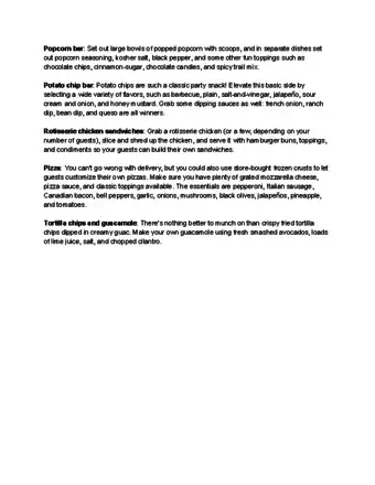 - Make sure you have plenty of finger foods that are like main dishes in addition to snack foods. You want to make sure your party guests stay satiated. Appetizers like meatballs, pigs in a blanket, bean dip, or chicken wings are a good idea to serve.