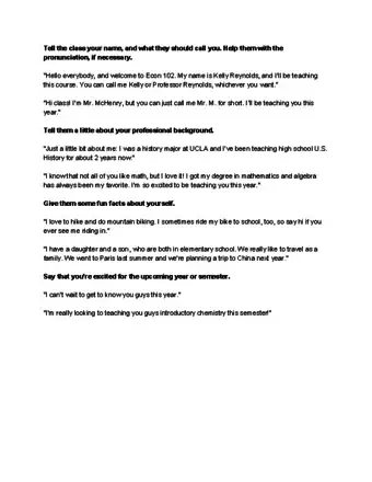1Greet students and introduce yourself once everyone is seated. Include your name (what you would like them to address you by), your academic background, and your interests. You could say something like, “Good morning class, my name is John Smith, you can call me John or Professor Smith. I received my degree in Communications from XYZ College and my masters from ABC University. I just moved to the area recently and enjoy exploring downtown and going hiking with my dog, Bruce.”