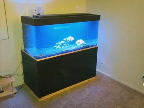 1Install aquarium tank, base, and lighting: Set up a mid-size to larger sized aquarium such as 50 gallons to 150 gallons (200 liters to 560 liters).