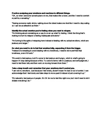You've completed the hardest step of your recovery from an eating disorder, but it's not quite over yet. You'll still need to take steps like sticking to a meal plan and avoiding triggers to stay on track. Managing your emotions will also help you avoid relapsing, as most eating disorders are emotion-based. Getting support in the form of friends and family, support groups, and therapy can help you stay on the recovery track for a long, long time.