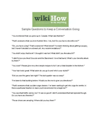 - If you're not sure what the person would like to talk about, ask questions that you would enjoy being asked yourself.[2]