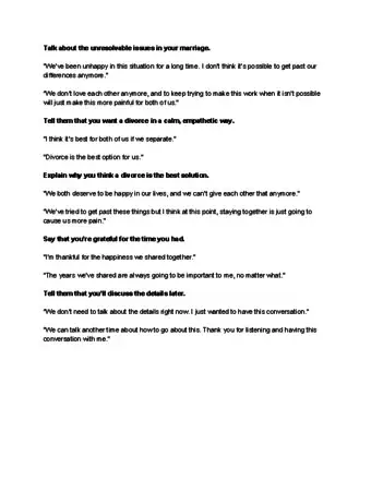 - Mention specific issues, such as, “We don’t treat each other kindly anymore, and I can’t remember the last time we said more than 2 words to each other. We seem to hold resentment for each other, and I don’t think this environment is good for either of us.”