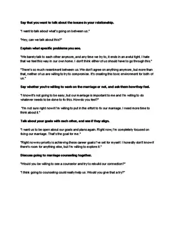 - If you’re willing to try to work things out, you might say, “We both have a lot of work to do, but I’m willing to put forth the effort. Will you consider seeing a counselor and trying to rebuild our connection?”