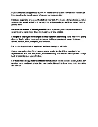 Losing fat from the upper half of your body requires a few different approaches. You’ll need to do some cardio workouts to burn fat. Exercise your chest and arms and your back to emphasize your muscles and get rid of pesky back fat. And eating a healthy diet can make sure your hard work in the gym doesn’t go to waste.