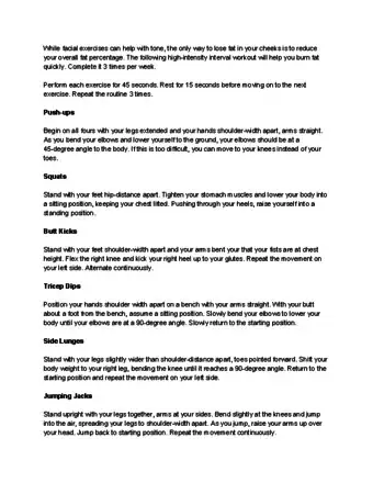 The best way to lose weight from your cheeks is by losing weight overall. Be sure to drink at least 72 ounces of water every day to keep your body hydrated, and avoid salty and sugary foods, as well as alcohol, which can cause your body to store water weight in your cheeks. Then, maintain a balanced diet including vegetables, fruits, lean meat, and calcium-rich foods like yogurt. You can also try to smile more often to exercise your cheek and mouth muscles and appear happier! For more tips from our Personal Trainer reviewer, including cheek exercises you can do, read on!