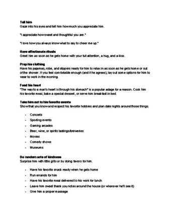 Dating Coach & MatchmakerOur Expert Agrees: Don't get complacent in your relationship. At least once a month, get dressed up and go out together. In addition, communicate openly about sex and try new things, and be physically affectionate in non-sexual ways, like giving each other foot rubs or back massages.