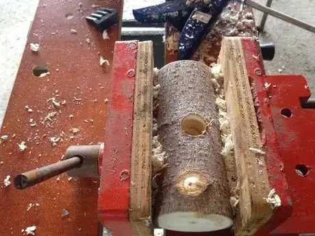 2Drill a hole for the handle. Place your mallet head in a vice, making sure it is level and that the bottom does not have any knots to catch the ground when you are swinging. Also make sure the top does not have a knot, as this will make drilling excessively hard! Take a drill bit matching the diameter of your broomstick (ours was ¾ inch). Using tape or a marker on the drill bit identify how deep you should drill into the mallet head so that the bit does not go all the way through. We drilled about ¾ down into the mallet head, which was about 2 inches (5 cm) deep on average. We put tape on the 2 inch (5.1 cm) mark on the drill bit so that we knew how far down the bit had gone.Advertisement