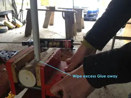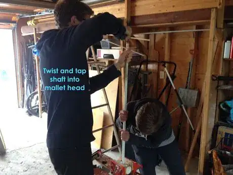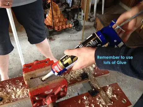 5Insert the shaft. Before the glue dries slide the broomstick into the glued hole. This may require some force to get it all the way in. You can also take a hammer and tap the top of the stick until it becomes apparent the stick has bottomed out.