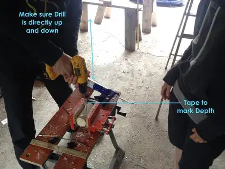 3Get someone to help you make sure your drill is straight up and down the entire time you are drilling (if your drill doesn’t have a bubble level on it).
