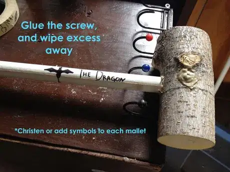 7Insert screw. Take some glue and apply a generous amount to the end of your screw. Slowly screw the screw most of the way in your pre-drilled hole, but then back it out and let glue at the top of the hole cling to the threads of the screw. Screw it back in all the way either counter sinking the screw head (very slowly) or until the screw head is flush with the surface of the mallet. Use your finger to wipe away excess glue.