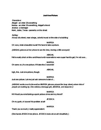 - The top of your script should have the title of your skit. Below you may want to write out the names of the characters involved, and even the name of the actor playing that character.