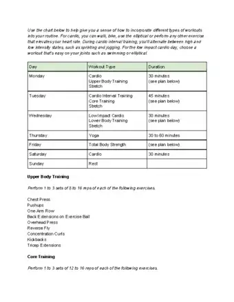 To make a workout plan, start by looking at your schedule and finding some free time you can use to exercise. Next, determine what your goals are, such as muscle building or weight loss, and search online for an exercise regimen that fits those goals. In general, aim to do about 2 hours of cardio along with some weight training each week. Also, alternate the types of workouts you do each day to keep your workouts motivating and fun. For example, try a kickboxing class one day and swim laps the next. For tips from our Fitness reviewer on how to build your endurance when you first start working out, read on!