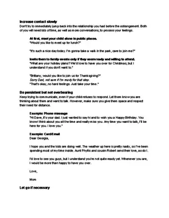 - Put the ball in your child’s court. Send a note or leave a voicemail that says something like, “Peter, I understand that you want me to stop contacting you. Though it upsets me, I will respect that and will not contact you after this. If you ever want to reconnect, I will be here, but I will honor your wishes and not be in touch again. I love you.”