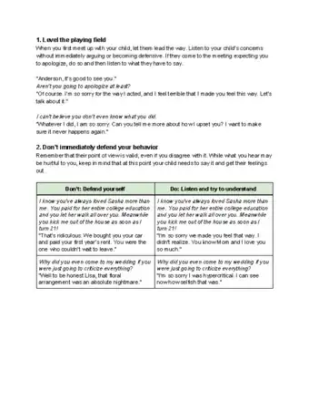 - It may be helpful to start off your meeting with an apology to let your adult child know that you understand that you caused them pain, and give them a sense of “leveling the playing field.” Once you apologize, you could ask your child to tell you more about what they have been feeling.