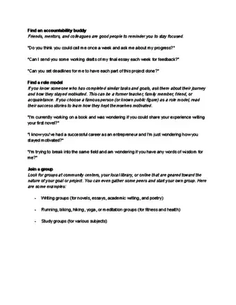 Motivation can give you that extra push to get something done, but it doesn't always come when you need it. If you're struggling to start or complete a task, give yourself some encouragement to keep going. A little bit of pressure can help, so ask a friend, family member, or group to keep you accountable. If you're trying to achieve long-term plans, make sure that you have clear and manageable goals so that you maintain your motivation throughout the process.[1]