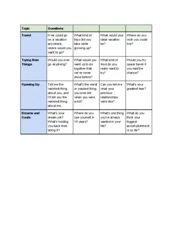 - Ask questions like, “What is your most treasured memory?” and “What, if anything, is too serious to be joked about?”