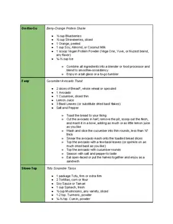 Vegan meals are meals that don't contain any meat or animal products, including eggs and dairy. Vegan meals don’t have to be a hassle, especially if you plan them out in advance. For an entire week of delicious vegan meals, plan ahead so that you have meals that are both easy to make and nutritious. There are a wide variety of tasty meals that you can prepare for all meals and occasions.