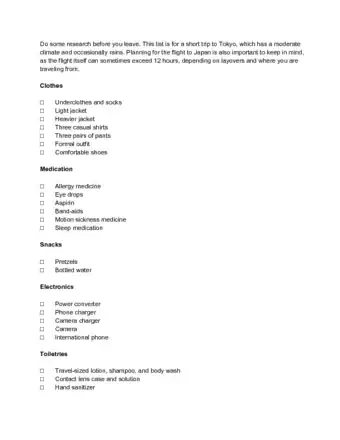 1Buy everything you'll need. Buy film, or keep digital camera batteries on hand. Do you have the right plug-in adapter for wherever you're going? How about gear for the weather? A guidebook? A language book? What will make your trip go off without a hitch?[11]