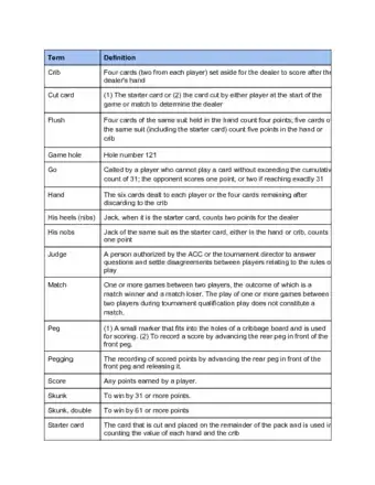 To play Cribbage, you'll need a Cribbage board, pegs, and a deck of cards. The goal of Cribbage is to score 121 points before your opponent by creating different card combinations. To start the game, shuffle the deck and have each player take half of it. Whoever has the lowest card on the bottom of their half deals first. Deal 6 cards to each player. Then, each player looks at their hand and chooses 2 cards to remove from the game. Place these cards off to the side face-down. These cards are called the "crib." Next, cut the deck and reveal the top card on the bottom half. This card is the starter card. The starter card is used to help calculate points at the end of play. If the starter card is a Jack, the dealer starts the game with 2 points automatically. After the starter card is revealed, the non-dealing player reveals a card from their hand. Then, the dealer reveals a card on their side of the table. Each card’s numeric value is added to the previous card’s numeric value to track the score up to a total of 31, with kings, queens, and jacks counting for 10, and aces counting as 1. Each player announces the running total as they play their card. For example, the non-dealing player may put a 6 down and say, “6.” The dealer then may play an 8 and say, “14.” The running total can never exceed 31. If a player cannot play a card from their hand without exceeding 31, they say, “Go,” and the other player scores 1 point. The scoring player may then play another card without exceeding 31. If a player reaches exactly 31, they get 2 points. After reaching 31 or “Go,” the running total resets to 0 and the player that failed to score plays their next card. Keep track of the score by moving your peg into the corresponding slot on the board. Move it every time you score and add your points together. You can also score points by creating combinations of cards while playing your hand out, which is called “pegging.” These points are calculated at the end of the round after all of the cards have been played. When both players have played all of the cards in their hands, the cards are counted for points in the following order: non-dealer’s hand, dealer’s hand, then the crib. The starter card is assumed to be a part of both player’s hands while they’re scoring points. If you have any 2 cards that add up to 15, you score 2 points. If you played 2 cards of the same rank, you get 2 points. You get 6 points for playing 3 of the same card in a row, and 12 points for playing 4 of the same cards in a row. You also score 1 point for every card played in an ascending or descending order. For example, if the dealing player plays a 3, followed by another 3 and a 4, they’ve earned 3 points. The dealer counts their hand first, followed by the non-dealing player. Then, the crib is counted by the dealing player. Any combinations in the crib are scored for the dealer. Scoring for the crib is counted the same way as regular play, with one adjustment. If the face-up card on top of the deck shares a suit with a jack in the crib, the dealing player is awarded an additional point. When you're finished scoring a round, the non-dealing player from the previous round shuffles the cards and deals out a new hand. Keep playing until one player reaches 121 points and wins! For more tips, including how to score each hand and end the round, read on!