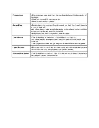 To play the card game Spoons, you'll need a deck of cards, 3 to 13 players, and enough spoons so you have one less than the number of people playing. The goal of the game is to be the last player left. If you end up without a spoon, you’re out! To set up the game, sit in a circle and place the spoons in the middle of the playing area. Then, deal 4 cards to each player, and place the rest of the cards face-down in a pile. Start the game by having the dealer take one card off the top of the deck. The dealer places that card in their hand, then passes one of the other cards in their hand to the player on their left. That player then passes one of their cards to the player on their left. This continues around the circle, with the dealer continuing to draw cards from the pile and the last player in the circle placing their cards in a discard pile. As you’re passing cards along, try to get 4 of a kind. Once you get 4 of a kind, take one of the spoons. At that point, everyone else can grab a spoon too. Whoever is left without a spoon is out. Then, the next round begins. Keep playing rounds until only one player is left standing! To download a printable rule sheet, read on!