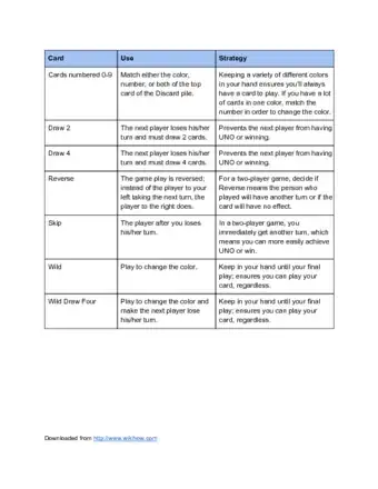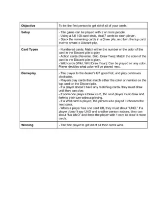 To play UNO, you’ll need at least 2 players, but the more you have, the better. Start by dealing 7 cards to each player, then place the remaining cards face down in the middle of the table. This is the “draw” pile. Turn the first card of the draw pile face-up and place it in a separate pile. This is the “discard” pile. The first player starts by playing a card that matches either the number, color, or type of the card on top of the discard pile. If a player wants to change the color in play for any reason, they can play a Wild card and choose a new color. If the player can't play any of their cards, they must draw a card from the draw pile. If the card drawn matches the color, number, or type of the card on top of the discard pile, they can play it. If not, the game moves onto the next player. As soon as a player is down to just one card, they must yell “Uno” before anyone else notices. If anyone else says “Uno” first, the player must draw two cards from the draw pile. The player that plays all of their cards first wins! As you play, you will notice several types of cards — a skip card, that skips the next player, a reverse card, that changes the direction of play, a draw two card, that forces that next player to draw two cards and skip their turn, and a wild draw four card, which is a combination of a wild and draw card. These cards make the game even more fun!
