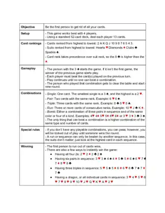 This exciting card game is suitable for anyone to learn to play. It's a perfect way to kill some time and have fun with family, friends or people you meet while traveling! The rules outlined here are the Vietnamese variant; there is a Chinese variant as well, so make sure you ask the other players what variant they want to play if they are experienced players. Note that this game is also called "Tiến lên" (Struggling Upstream) and it is a four player game.