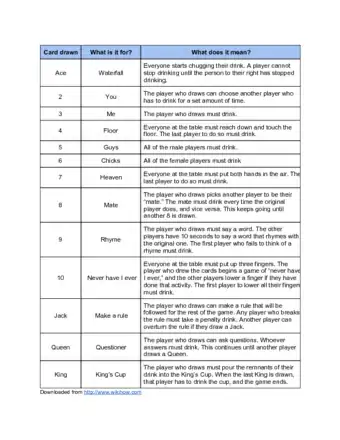 Play the basic, classic King's cup with this cheat sheet. To play, fan out a deck of cards, face down, around an empty cup (the "King's Cup"). Make sure everyone has a full drink of some sort. Players take turns drawing a card, then acting out the action described in the cheat sheet. For example, if someone draws a 3, that player must take a drink. If they draw a 5, all the guys playing must drink, etc. Continue until the final King is drawn or there are no more cards to turn over, whichever you prefer.
