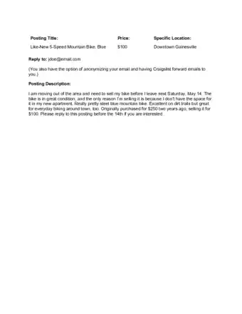 3Put down a contact email. Craigslist needs a contact email in order to create a post. The default email option will anonymize your email, which means that no one can see it from the site, or when they respond to an ad.