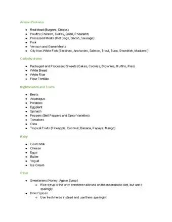 10Stay away from processed foods and artificial sweeteners. A macrobiotic diet strictly excludes processed or artificial foods, so you’ll want to make your dishes from scratch. Processed foods alter your body's energy, disrupting your balance. They're also considered to be unhealthy, according to the macrobiotic diet. This includes foods that contain preservatives.[13]