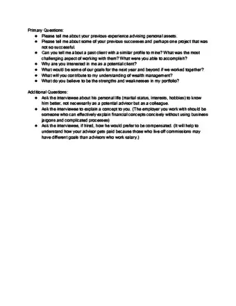 8Complete a questionnaire. Many financial planners will give you a questionnaire to fill out, which will ask for information about your income, debts, and assets. You will either need to take it to your first meeting or submit it ahead of time. Be sure to complete the questionnaire thoroughly to the best of your ability and keep a copy for your records.Advertisement