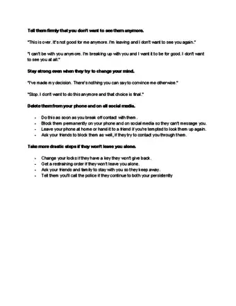 6Develop a safety plan if you believe they might become violent. If you’re concerned that ending the relationship could result in violence, consider breaking things off over the phone or via email. If you live with the person, ask trusted relatives or friends to help you get out of the situation safely.[9]