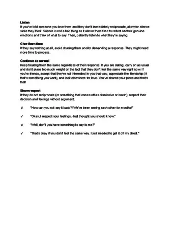 Expect some disappointment if you don’t say “I love you." The person may look disappointed or even embarrassed after saying “I love you” if you don’t reciprocate. This is normal. It’s fine to show empathy for them, but don’t feel pressured to say “I love you” or feel guilty for being honest about your feelings. Allow them a moment to sit with their feelings before you respond.[9]