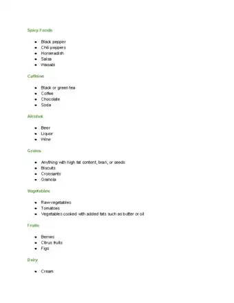 - Avoid foods that cause you discomfort. For many people, this includes coffee, caffeinated beverages, fatty foods, chocolate, and spicy foods.[15]