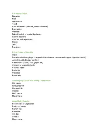 - Instead, consume lots of liquids, broths, or soups. Wait several hours after experiencing nausea or vomiting before consuming more food.