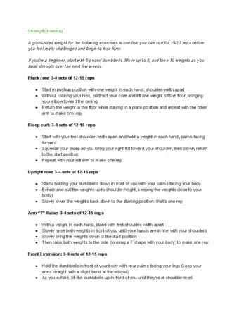 - Exhale as you curl the dumbbells towards your chest. Keep your gaze forward and your weight equal in your legs. Inhale and then lower the dumbbells until they are 3/4 of the way down. Activate your biceps muscles as you do this. This is 1 rep. Repeat this exercise for 2 sets of 10 reps.