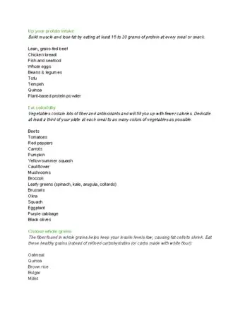 - Eat more vegetables, healthy fats, and lean protein. Each meal should include a serving of protein, 1 or 2 vegetable/fruit servings, and 1 complex carbohydrate serving such as a whole grain serving. Make sure your carb intake is in the recommended range of 20 to 50 grams (0.71 to 1.8 oz) per a day.[12]