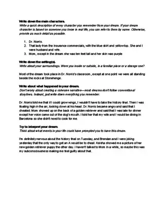 Note: If you can remember any dialogue, you may want to write it down first, as words in dreams are easily forgotten. Record everything you can, even if you can only remember one image. As you get the basics down, more of the dream may come to you.