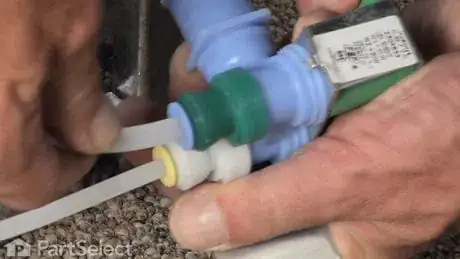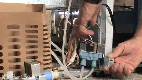 2Behind the water valve, you will have to disconnect the two electrical harnesses. Each harness will have two different pin sizes. When the pins have been removed, slightly pull the tubing out. When doing so, it's normal to see some water spill out.