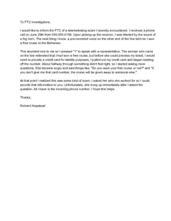 5Write or call the Federal Trade Commission about telemarketing scams. If a company calls with a suspicious offer, such as a free cruise, credit card, or loan offer, alert the FTC by going to their website and filing a complaint via the tools and links on the FTC's website.[1]