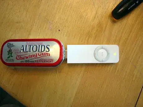 4Make an iPod shuffle case from a chewing gum tin. A hole can be made for the headphone cord.