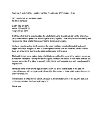 - For example, if you’re selling a large L-shaped couch, you might write. “This couch’s soft fabric and supportive structure make it perfect for comfy movie nights with the whole family.”