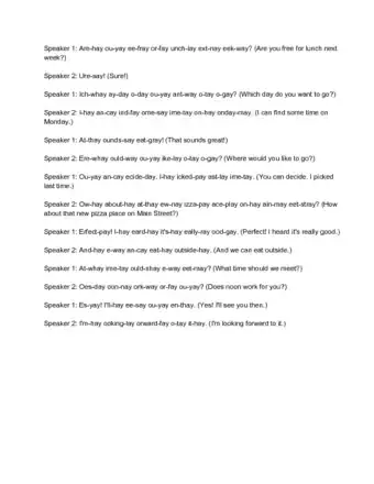 • What are you doing later? = At-whay are-way ou-yay oing-day ater-lay?